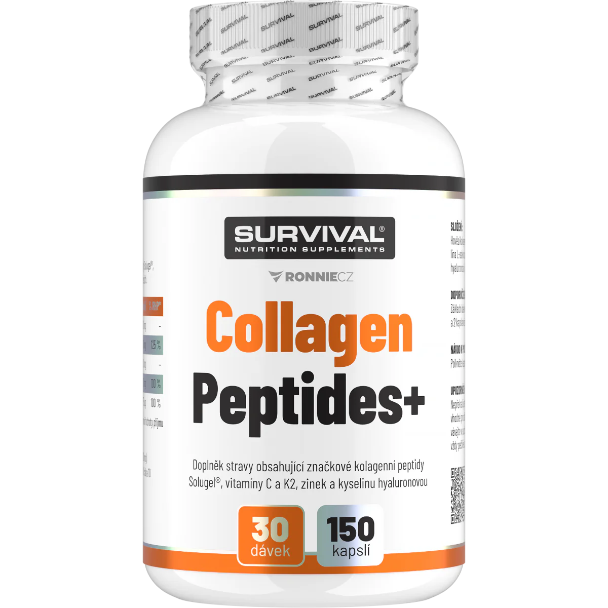 Doplněk stravy obsahující značkové kolagenní peptidy Solugel®, vitamíny C a K2, zinek a kyselinu hyaluronovou v kapslích. Kombinace účinných látek napomáhá ke správné tvorbě kolagenu, zlepšuje vzhled pokožky a vlasů, přispívá ke správnému fungování imunitního systému a tím zlepšuje odolnost organismu. Kolagen se vyskytuje v naší kůži, šlachách, kostech a vazivu, proto se Collagen Peptides+ postará především o pružnost, a to jak pokožky, tak pojivových tkání, podporuje správnou funkci kloubů a přispívá k ochraně buněk před oxidativním stresem. Kyselina hyaluronová pomáhá udržovat pokožku hebkou a dlouhodobě hydratovanou. Vitamín K2 je obsažen v nejlepší možné formě MK-7.